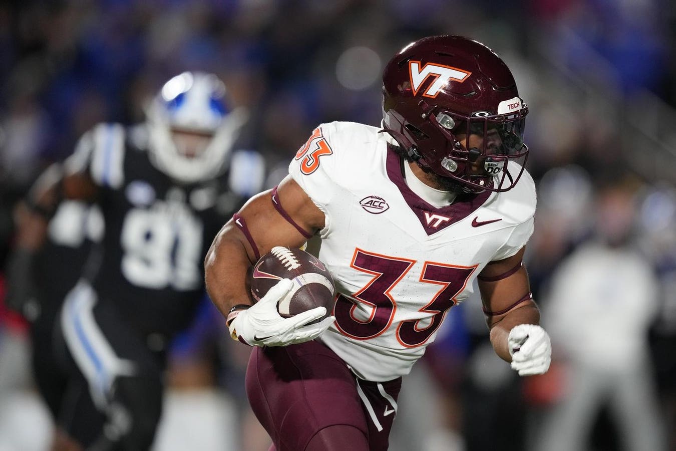 DURHAM, NORTH CAROLINA – NOVEMBER 23: Bhayshul Tuten #33 of the Virginia Tech Hokies runs the ball … [+] against the Duke Blue Devils during the game at Wallace Wade Stadium on November 23, 2024 in Durham, North Carolina. The Blue Devils won 31-28. (Photo by Grant Halverson/Getty Images)