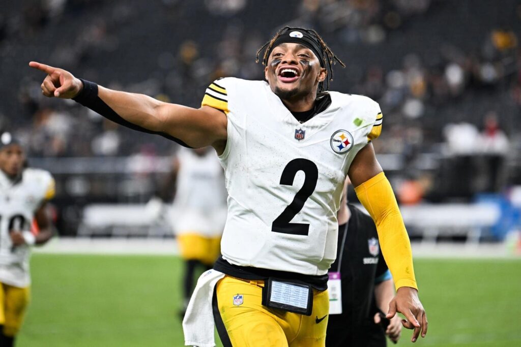 LAS VEGAS, NEVADA – OCTOBER 13: Justin Fields #2 of the Pittsburgh Steelers reacts after the … More