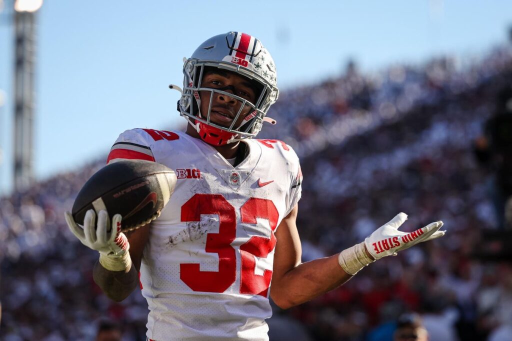 STATE COLLEGE, PA – OCTOBER 29: TreVeyon Henderson #32 of the Ohio State Buckeyes reacts after … More