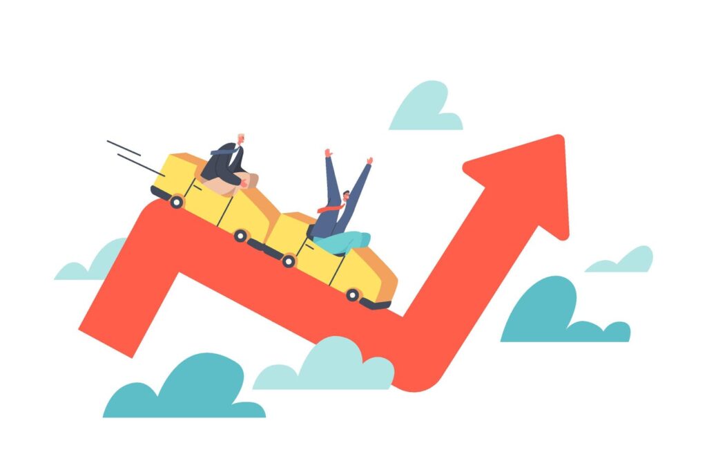 Businessmen Characters Investors Riding Roller Coaster on Red Chart, Fall on Uncertainty, Volatile … More Up and Down Arrow Profit Graph, Trading Risk, Invest Economy Panic Cartoon People Vector Illustration