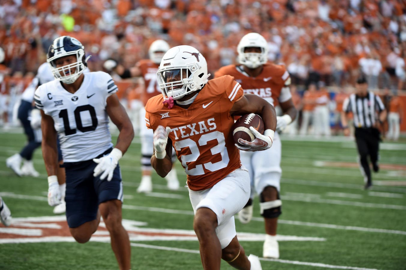 AUSTIN, TX – OCTOBER 28: Texas Longhorns RB Jaydon Blue (23) runs for a touchdown during the college … More
