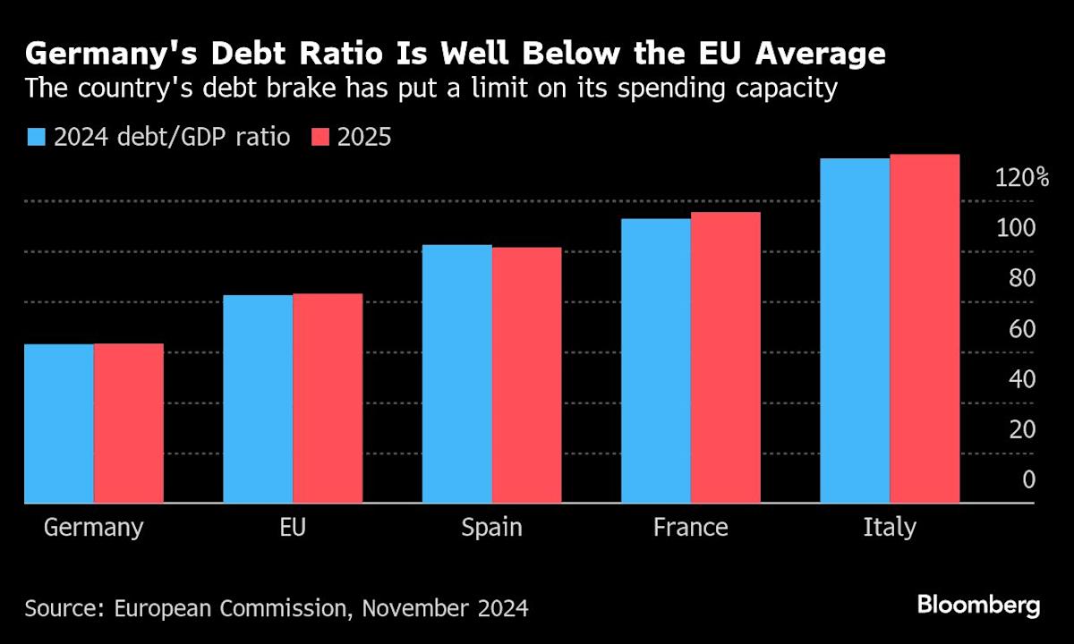 The debt brake was brought in by Merz’s conservative predecessor as chancellor, Angela Merkel, in 2009. It limits the amount of debt the government can raise and helped bring Germany’s debt pile down to 63% of GDP at the end of 2024.