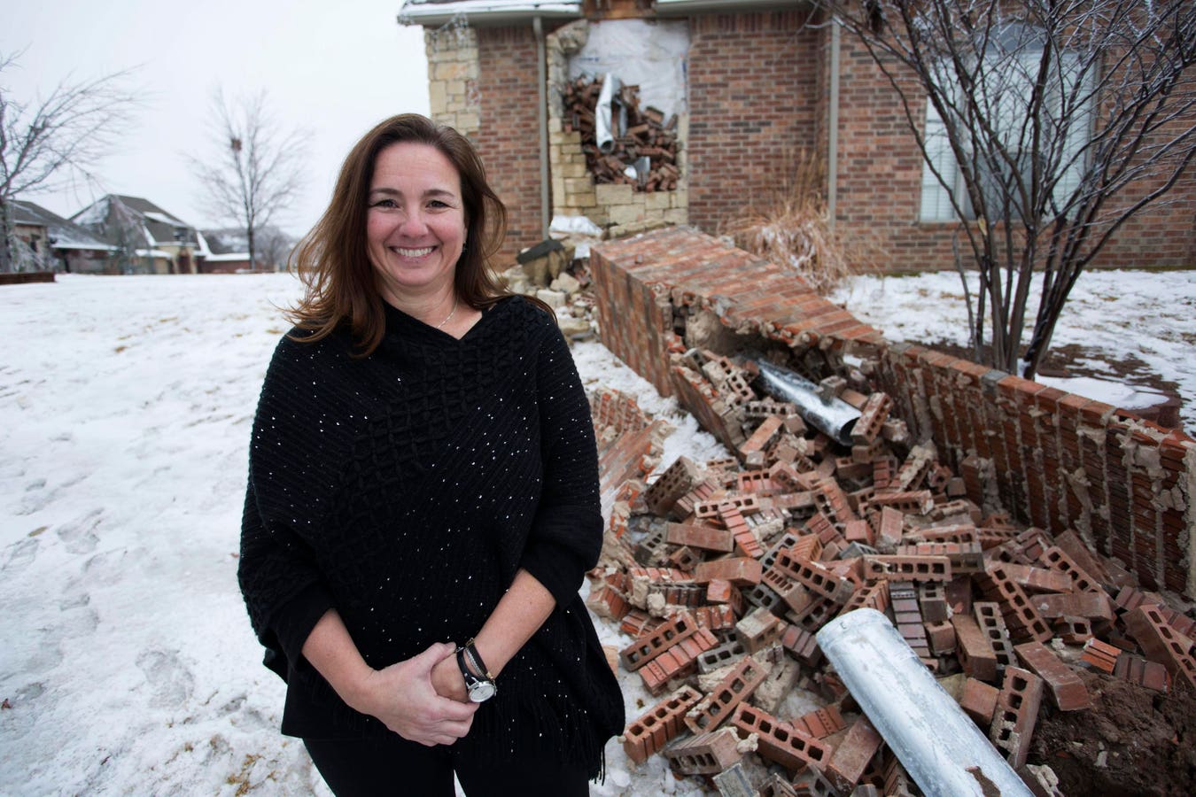 Dawne Sullivan, stands besides her home’s fireplace, December 29, 2015 in Edmond, Oklahoma. Her … [+] home was damaged by an earthquake.