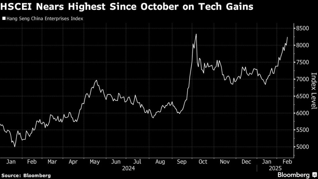 (Bloomberg) — Chinese stocks in Hong Kong extended a recent rally as the nation’s growing capabilities in artificial intelligence boosted optimism over the market’s outlook, while a potentially momentous show of support for the private sector gave sentiment an extra lift.