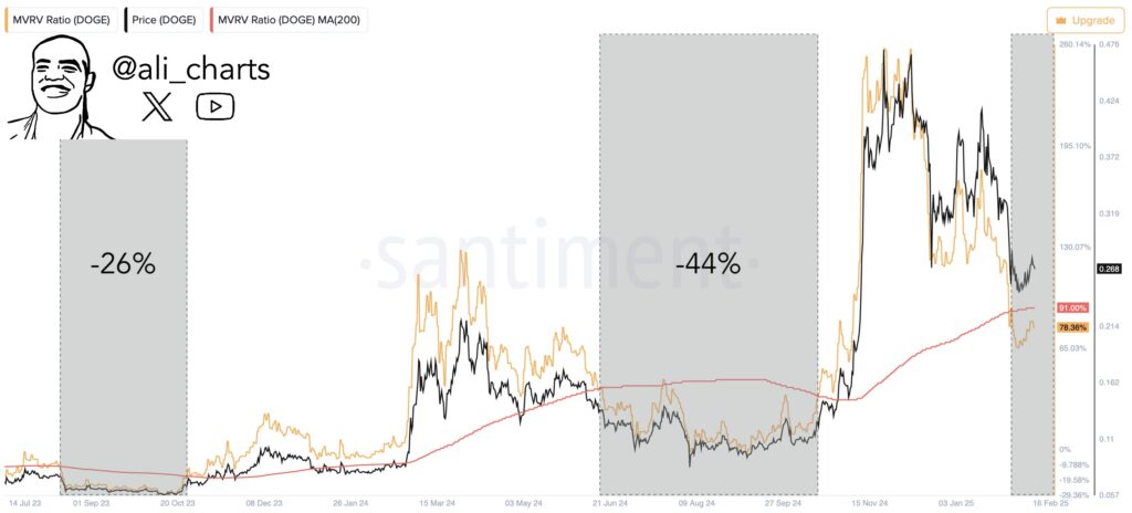 Both downturns appear in shaded areas on the chart, labeled accordingly. After each of these drawdowns, Dogecoin’s price eventually rebounded, but only after reaching notably lower price levels. Looking closer at the chart, Dogecoin’s price is shown trading around $0.268. The MVRV ratio (orange line) has climbed near 91%, while the 200-day MVRV Ratio MA (red line) hovers around 78.36%.