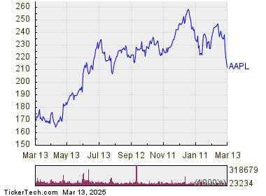 In trading on Thursday, shares of Apple entered into oversold territory, hitting an RSI reading of 29.7, after changing hands as low as $213.63 per share. By comparison, the current RSI reading of the S&P 500 ETF (SPY) is 29.6. A bullish investor could look at AAPL’s 29.7 RSI reading today as a sign that the recent heavy selling is in the process of exhausting itself, and begin to look for entry point opportunities on the buy side. The chart below shows the one year performance of AAPL shares: