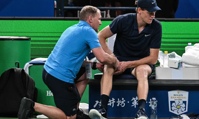World number two Jannik Sinner’s title defence ended in agony on Sunday when the Italian struggled to walk due to a cramp in his right thigh before he retired in the deciding set of his third-round clash with Tallon Griekspoor.