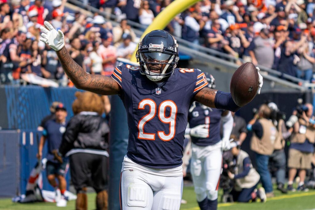 CHICAGO, IL – SEPTEMBER 08: Tyrique Stevenson (29) of the Chicago Bears celebrates after scoring on … More an interception during the game between the Tennessee Titans and the Chicago Bears at Soldier Field on September 8, 2024 in Chicago, Illinois. (Photo by Ben Hsu/Icon Sportswire via Getty Images)