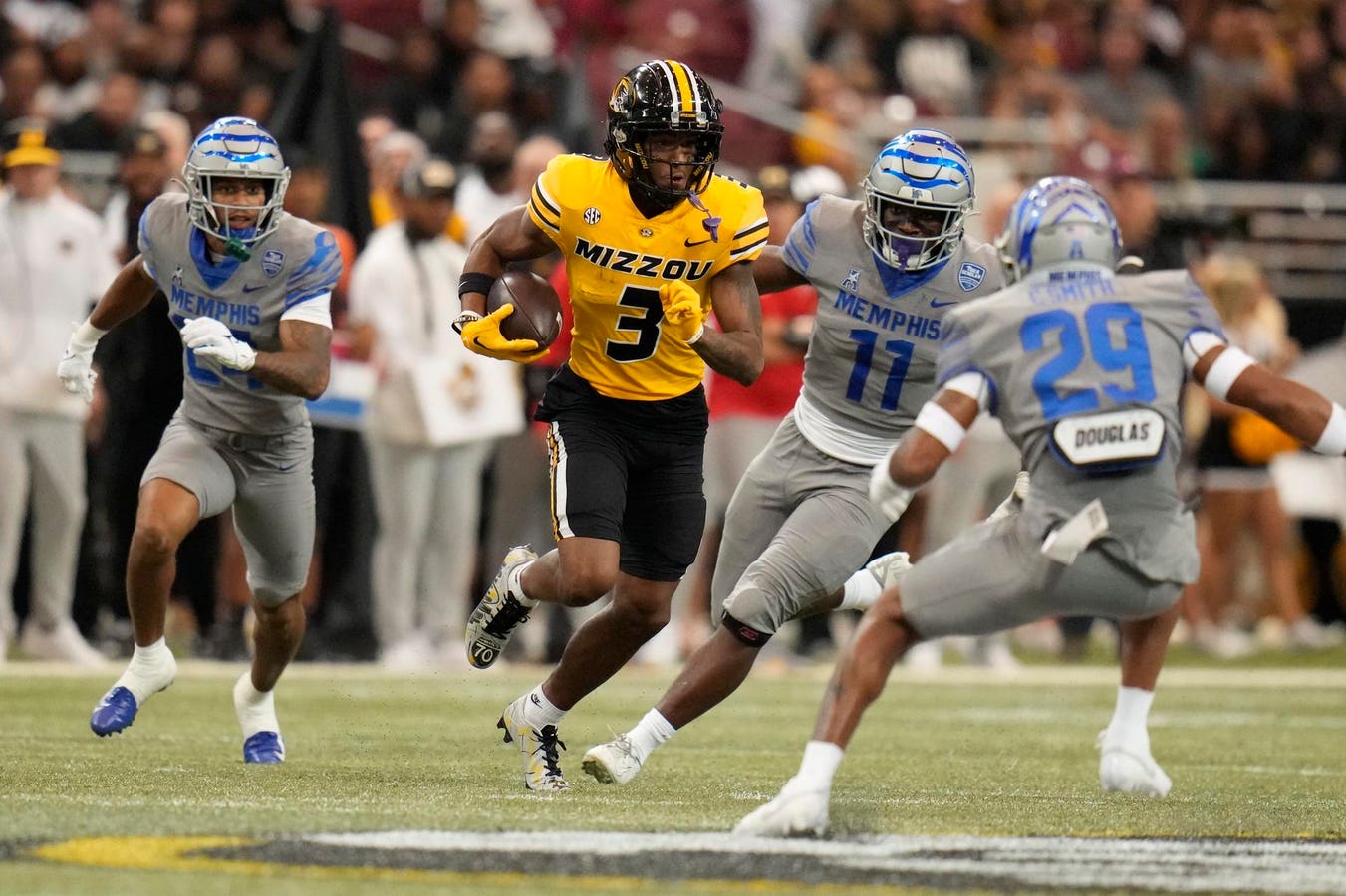 Missouri wide receiver Luther Burden III (3) runs with the ball as Memphis defensive back Greg … More Rubin, left, linebacker Chandler Martin (11) and defensive back Cameron Smith (29) defend during the first half of an NCAA college football game Saturday, Sept. 23, 2023, in St. Louis. (AP Photo/Jeff Roberson)
