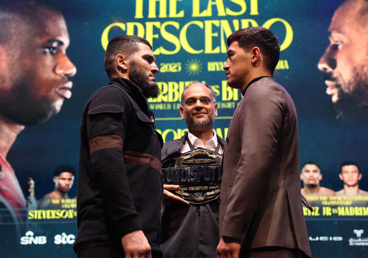 LONDON, ENGLAND – JANUARY 13: Artur Beterbiev and Dmitry Bivol during the Launch Press Conference … [+] of their Undisputed IBF, WBC, WBA and WBO Undisputed Light Heavyweight Title fight at Riyadh Season Boxing event next month, on January 13, 2025 in London, England. (Photo by Mark Robinson/Getty Images)