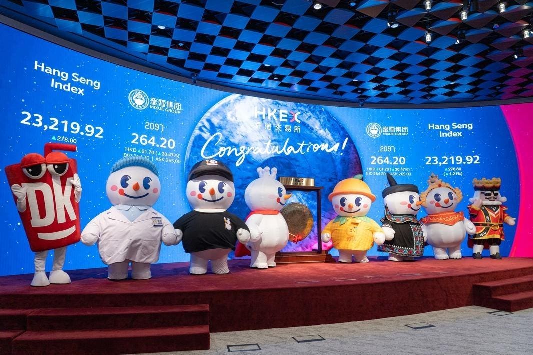 Mixue’s mascot, the Snow King, took the stage at the bubble tea chain’s IPO ceremony at the Hong Kong stock exchange on March 3, 2025.