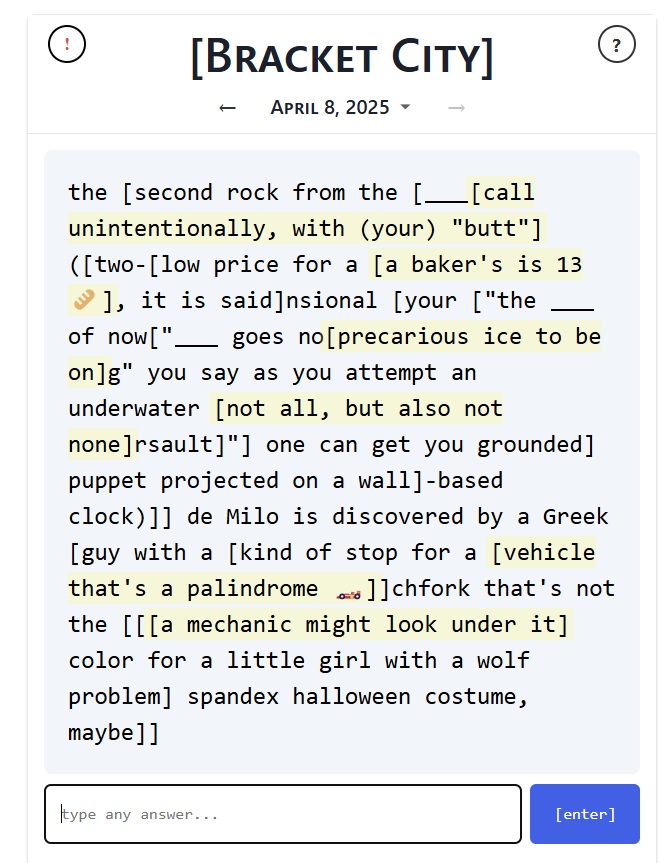 A screenshot of Bracket City, containing nested, highlighted clues that reveal a fact of the day when solved.