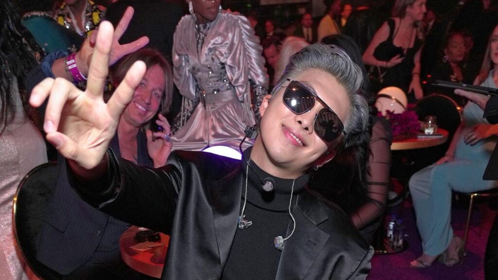 RM and Tablo’s “Stop the Rain” hits No. 1 on U.S. iTunes and may be headed for the Billboard charts … More in a few days. LAS VEGAS, NEVADA – APRIL 03: RM of BTS during the 64th Annual GRAMMY Awards at MGM Grand Garden Arena on April 03, 2022 in Las Vegas, Nevada. (Photo by Kevin Mazur/Getty Images for The Recording Academy)
