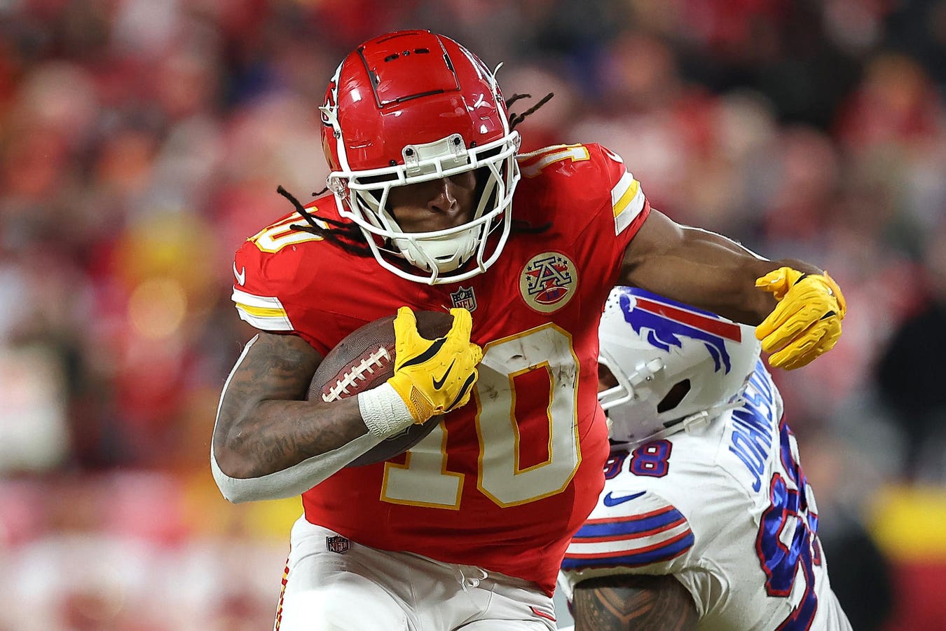 Isiah Pacheco of the Kansas City Chiefs runs the ball against the Buffalo Bills during the second … More