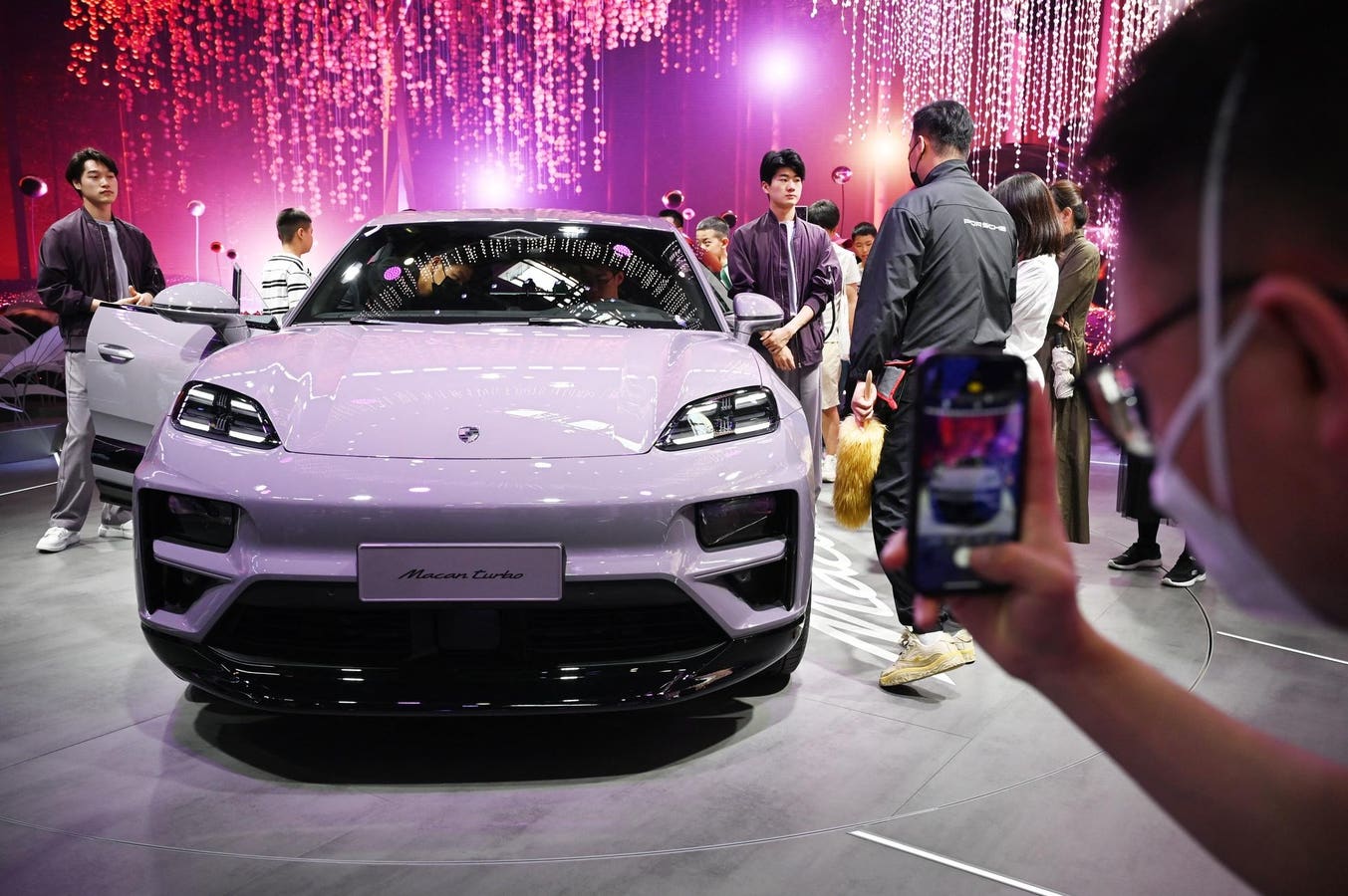 A man takes a photo of an electric Porsche Macan Turbo at the Beijing Auto Show in Beijing on May 3, … More