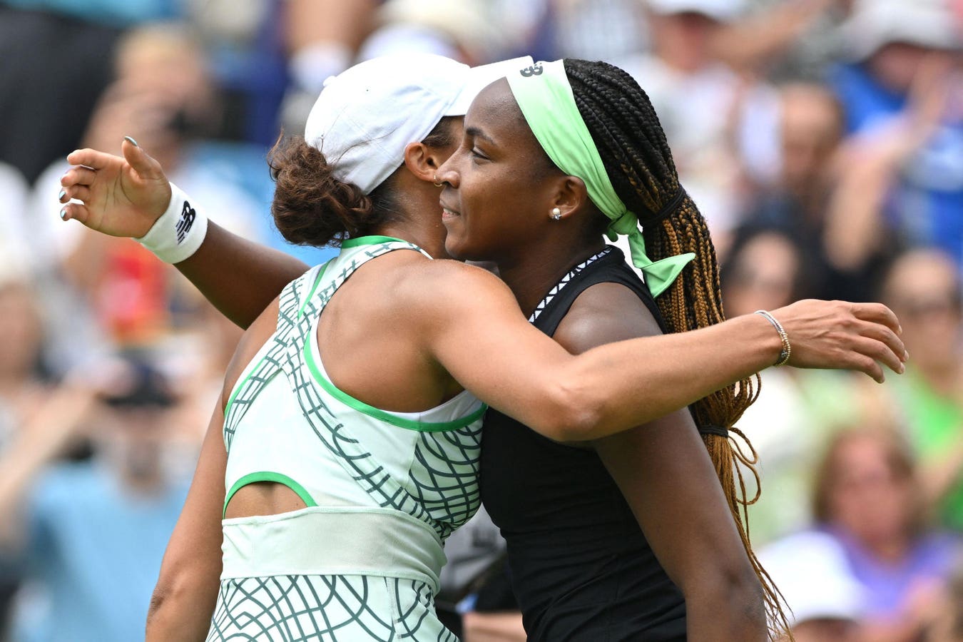 US player Madison Keys (L) is congratulated by US player Coco Gauff after their women’s singles … More semi-final tennis match at the Rothesay Eastbourne International tennis tournament in Eastbourne, southern England, on June 30, 2023. (Photo by Glyn KIRK / AFP) (Photo by GLYN KIRK/AFP via Getty Images)