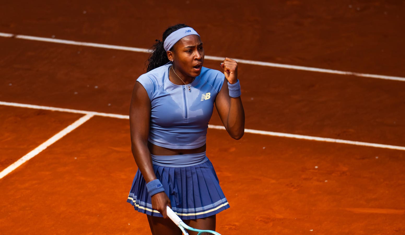 MADRID, SPAIN – APRIL 24: Coco Gauff of the United States reacts to defeating Dayana Yastremska of … More Ukraine in the second round on Day Three of the Mutua Madrid Open at La Caja Magica on April 24, 2025 in Madrid, Spain (Photo by Robert Prange/Getty Images)