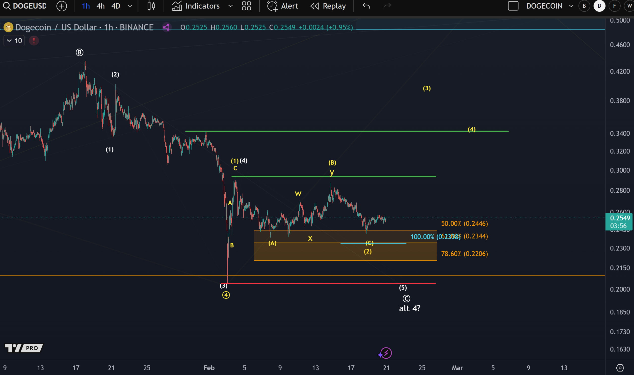 In the latest leg downward, the analyst’s markings show a major swing low around $0.21–$0.22, which coincides with a potential wave (4) on the chart, although there is an “alt 4?” label suggesting this may still be an alternative count which drags the DOGE price even deeper in one last correction.