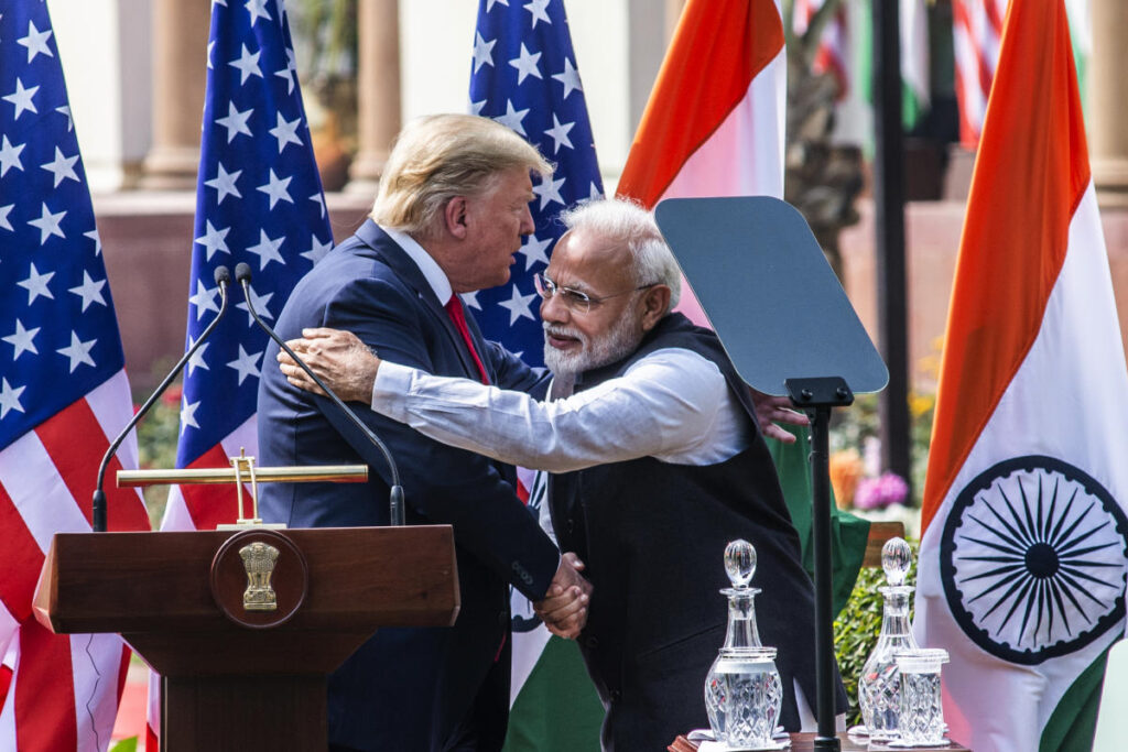 President Donald Trump and Prime Minister Narendra Modi embrace during a visit in February 2020 in New Delhi. (Pradeep Gaur/Mint via Getty Images) ·Mint via Getty Images