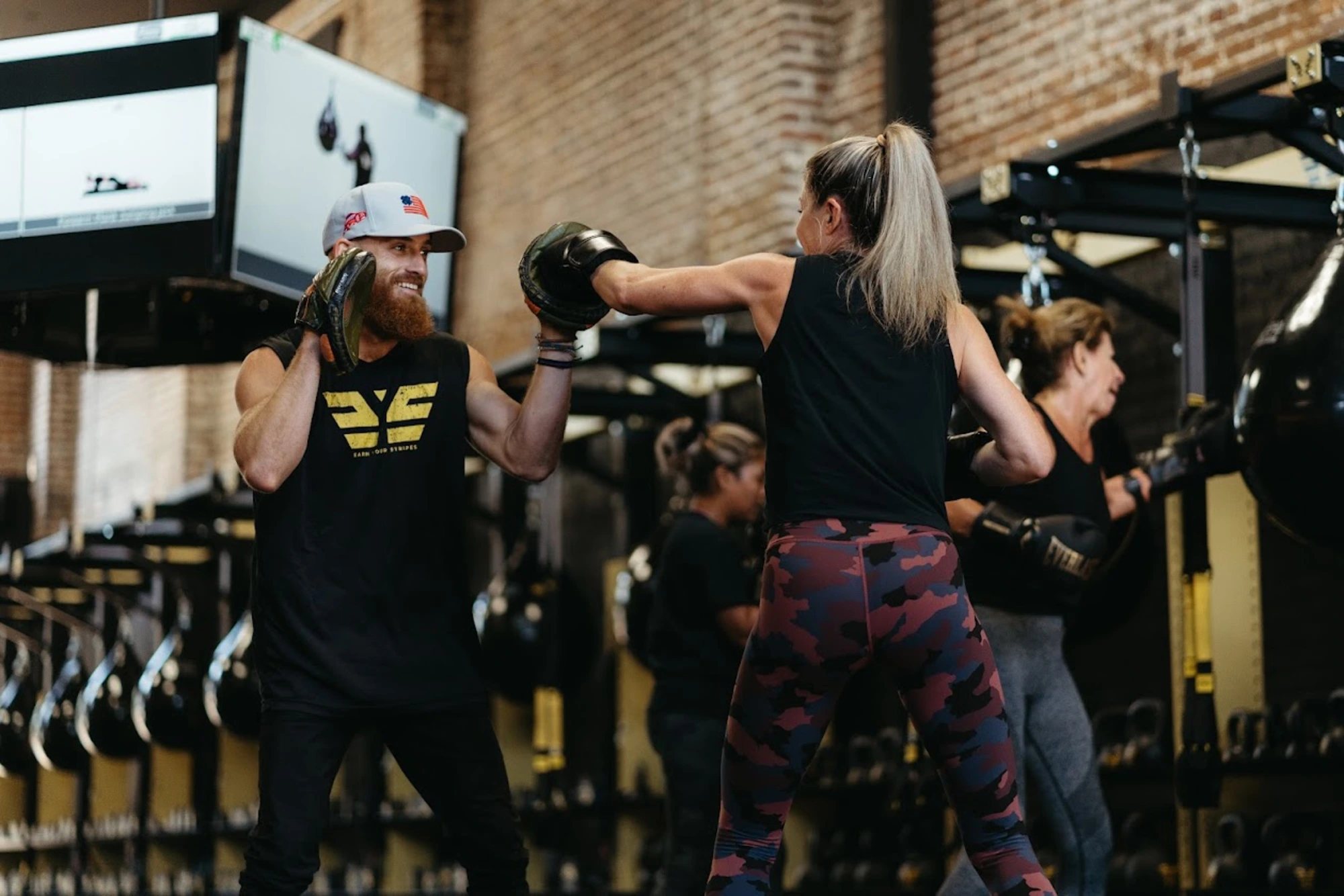 EYS Combat: A 50-minute, two-station high-intensity workout alternating between boxing combinations and full-body floor work