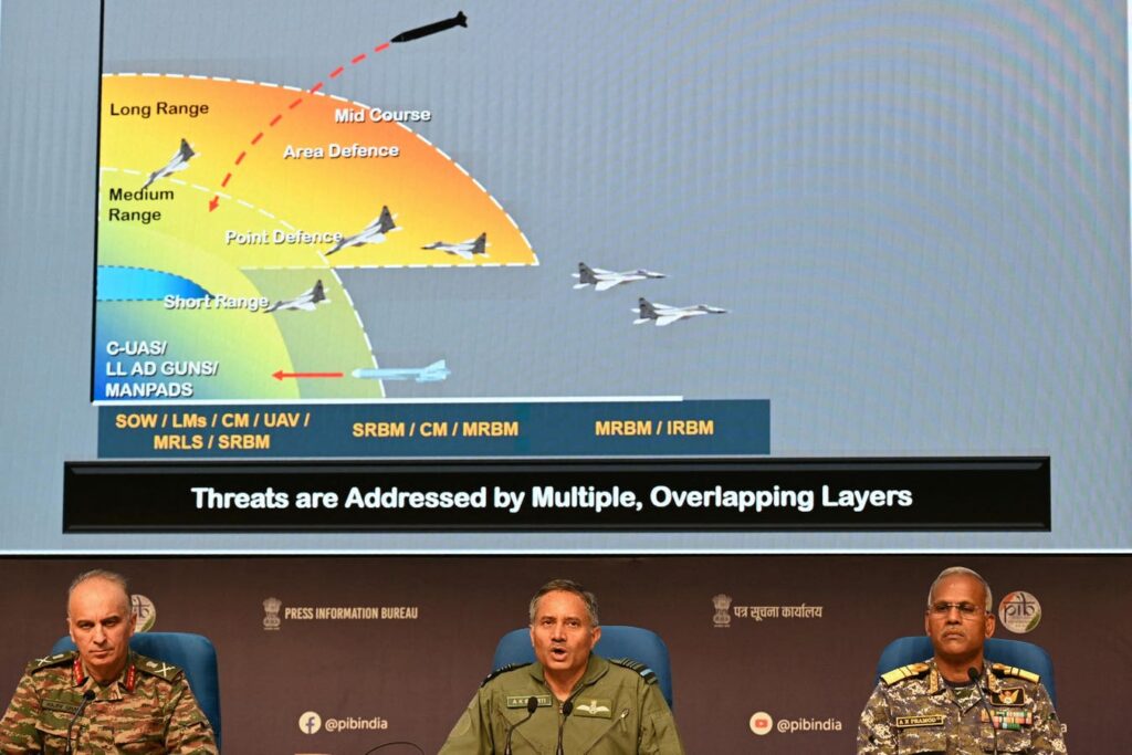 Indian Army Director General of Military Operations Lt. Gen. Rajiv Ghai (L), Indian Airforce Air … More Marshal AK Bharti (C), Indian Navy Vice Admiral AN Pramod (R) addresses during a press conference in New Delhi, on May 12, 2025. (Photo by Arun SANKAR / AFP) (Photo by ARUN SANKAR/AFP via Getty Images)
