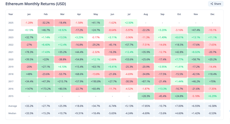 If this outperformance continues, then this would be only the second time that the Ethereum price will be doing better than the Bitcoin price so far in 2025. The first was back in May, when the Ethereum price rallied by over 41% in one month. This was major compared to Bitcoin’s 11.1% move in that month.