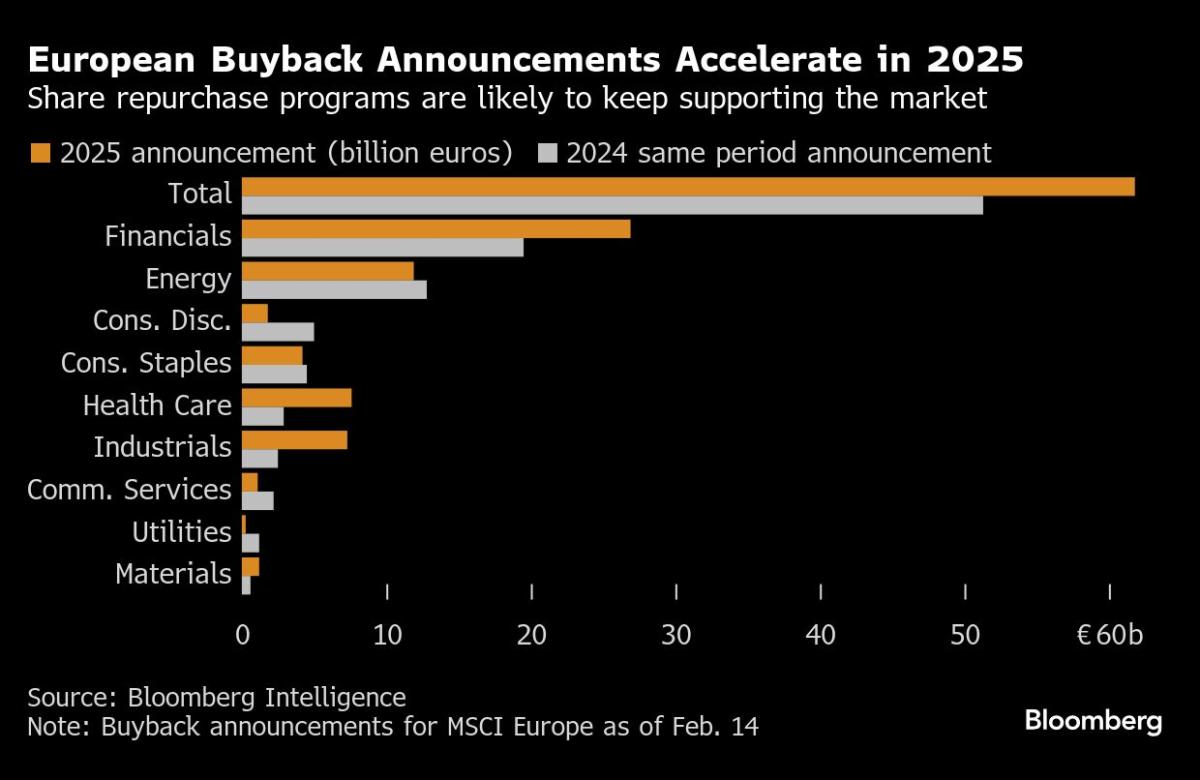 Share buybacks unveiled during earnings are providing another major boost. Financial firms have been the biggest contributor to repurchase programs announced since the start of the year. That means banks look set to be the largest provider of shareholder returns once again this year, after accounting for nearly a fifth of the dividends and buybacks of Stoxx 600 companies in 2024.