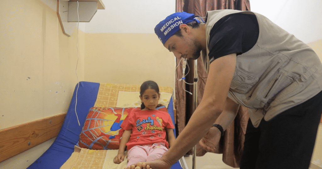 Dr Hijjawi is also on his rounds, speaking to a little girl, gently examining her leg and asking her to “lift both feet off the bed for me”. Then he asks a little boy to wiggle his toes so he can check on how he’s healing.