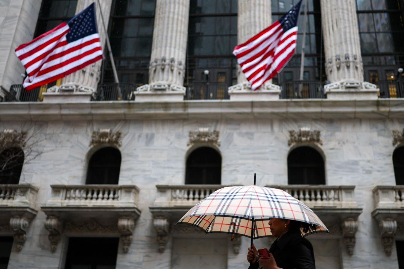 A woman holds an umbrella while she walks past the New York Stock Exchange (NYSE) in the Financial … More