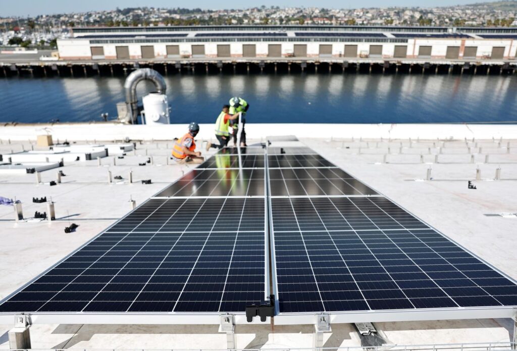 LOS ANGELES, CALIFORNIA – APRIL 21: Workers install solar panels during the completion phase of a … More 4-acre solar rooftop atop AltaSea’s research and development facility at the Port of Los Angeles, in the San Pedro neighborhood, on April 21, 2023 in Los Angeles, California. The installation will supply enough energy to power AltaSea’s 35-acre campus, the country’s biggest ‘blue economy’ tech hub, which is focused on clean oceans, climate resiliency, and clean energy. (Photo by Mario Tama/Getty Images)