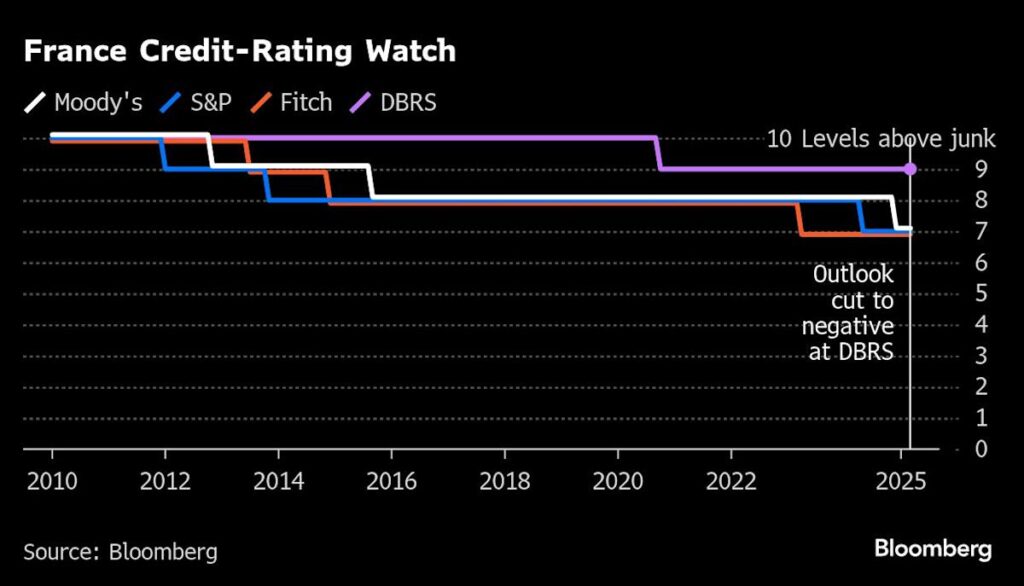 (Bloomberg) — Morningstar DBRS (MORN) put a negative outlook on its assessment of France’s creditworthiness, adding to warnings over the country’s debt burden amid growing demands for defense spending and persistent risks of political instability.