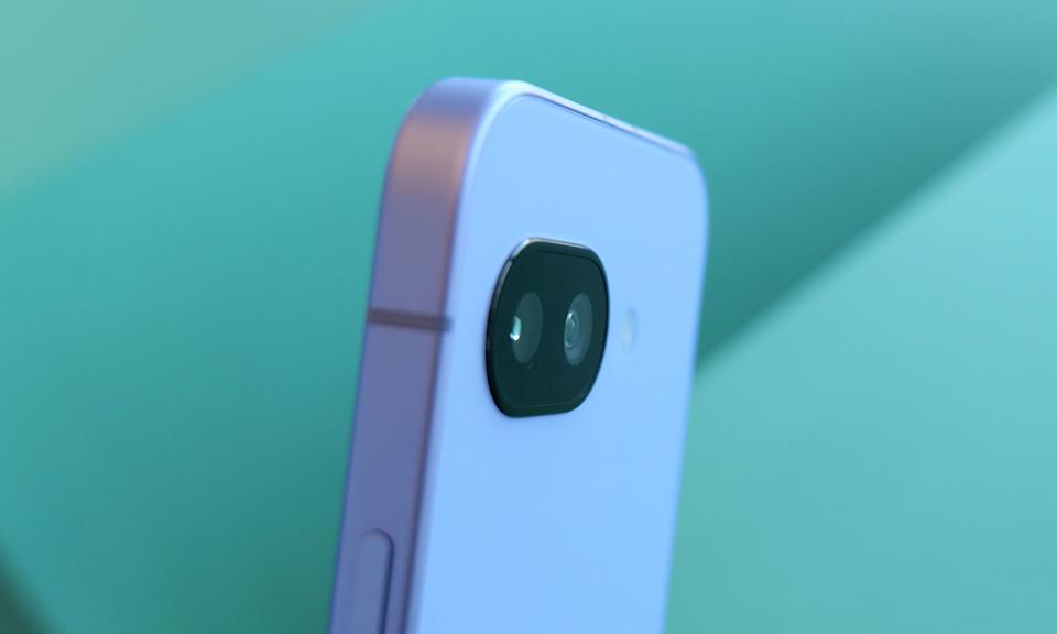 Angled view of the back of the Pixel 9a phone, showing its camera lens.