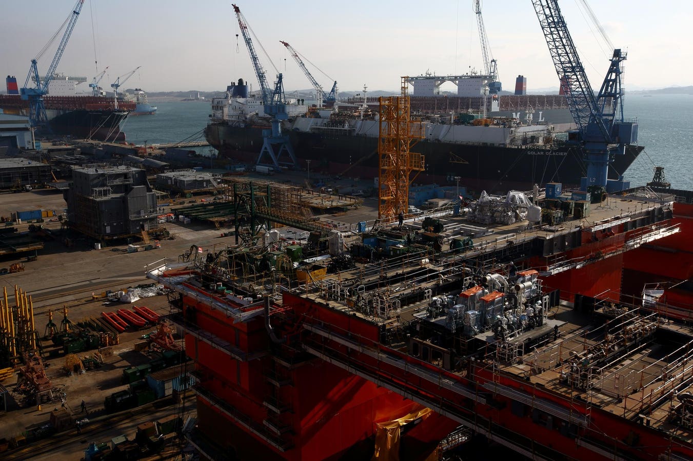 A Seadrill Ltd. semi-submersible drilling rig under construction in the dry dock, foreground. … More