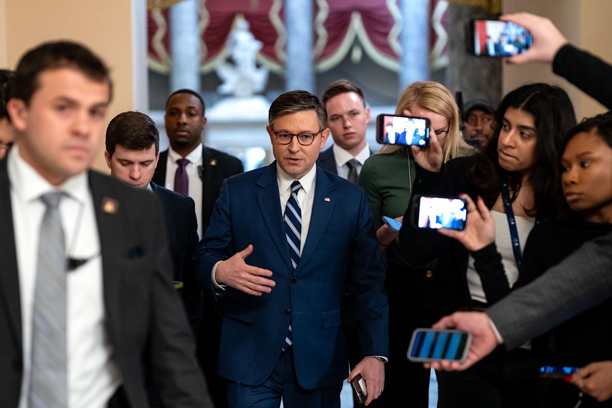 Speaker of the House Mike Johnson speaks with reporters at the US Capitol on Feb. 24. (Kent Nishimura/Getty Images) ·Kent Nishimura via Getty Images