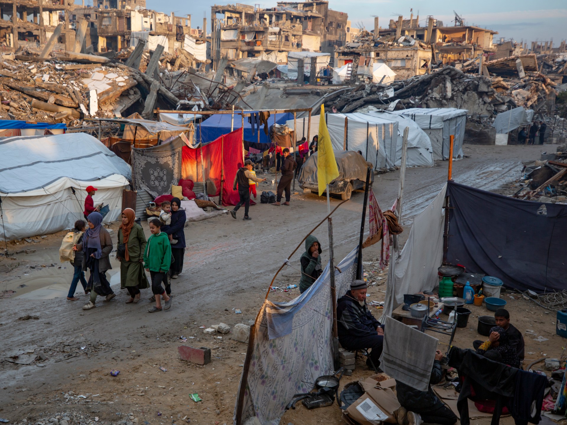 The enclave remains on the brink of humanitarian catastrophe, with the vast majority of its residents displaced and its infrastructure destroyed throughout the war.
