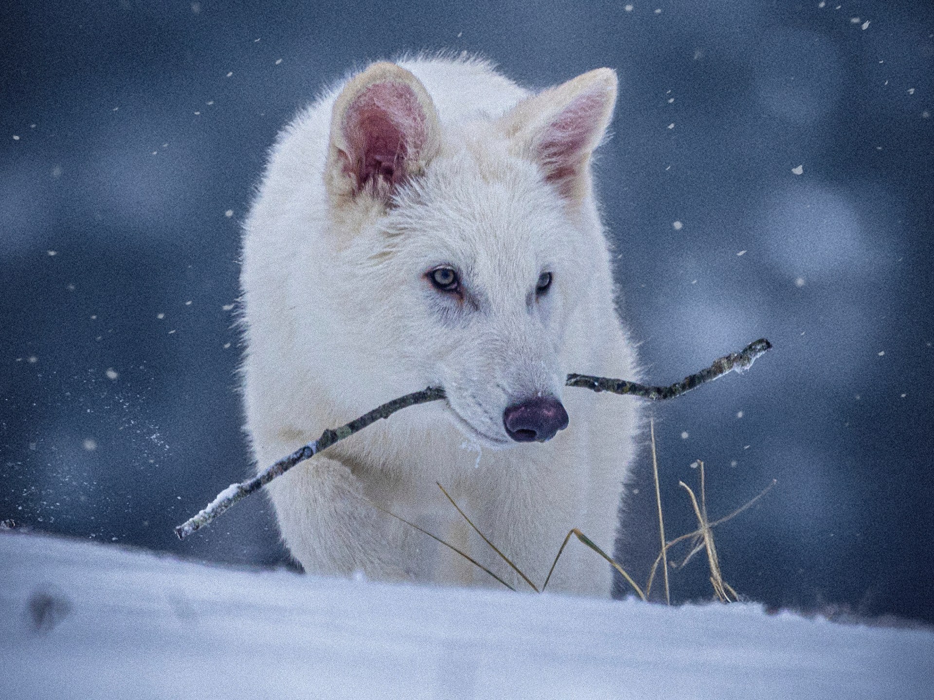The wolves exhibit physical characteristics such as white coats, larger body sizes, and broader heads.