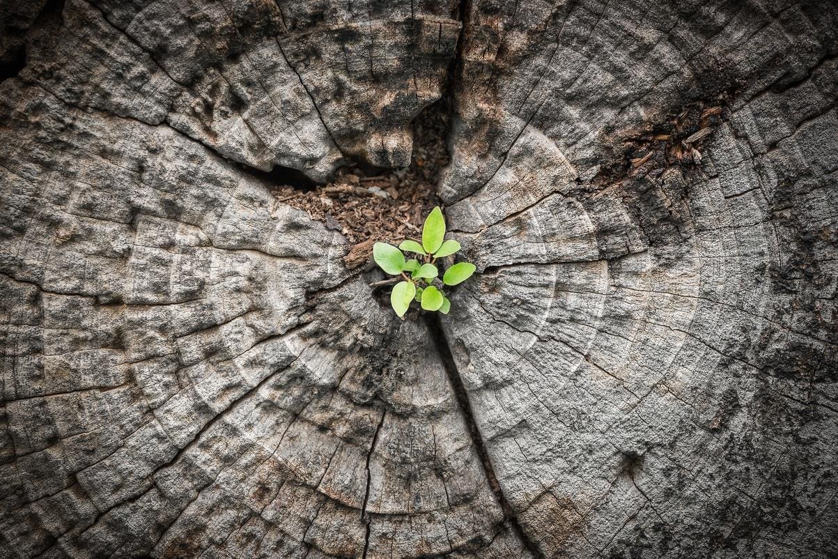 Close focus on small green tree grow from cracking area of dying wood in dark tone color