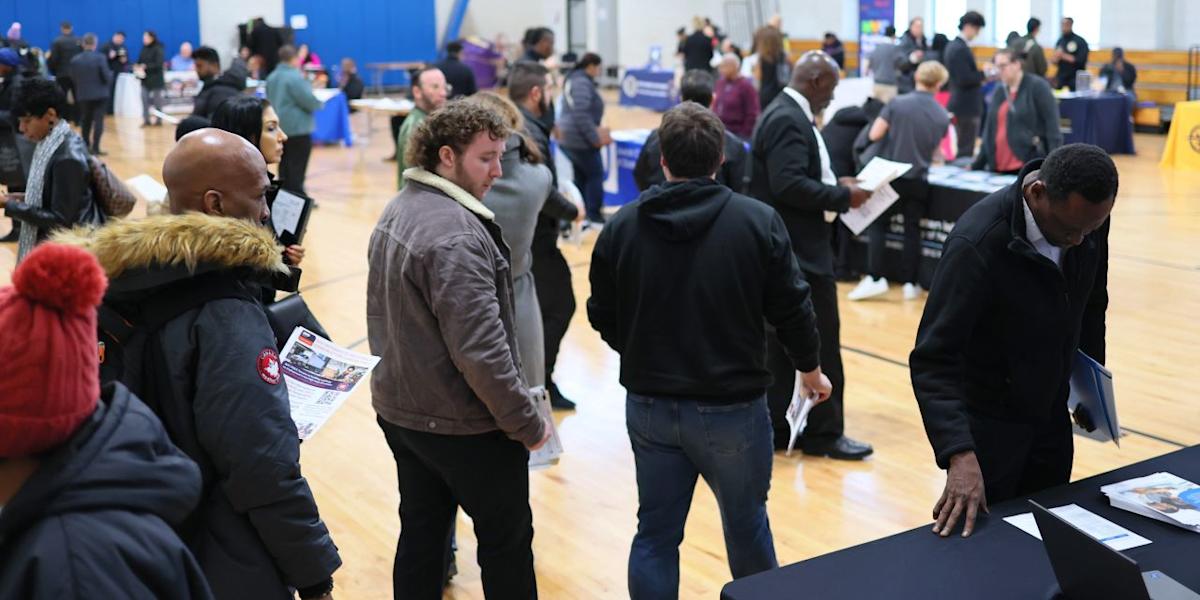 A job fair in New York City last month. Economists said the jobs report gives the Fed some breathing room to consider the path of rates. – Michael M. Santiago/Getty Images