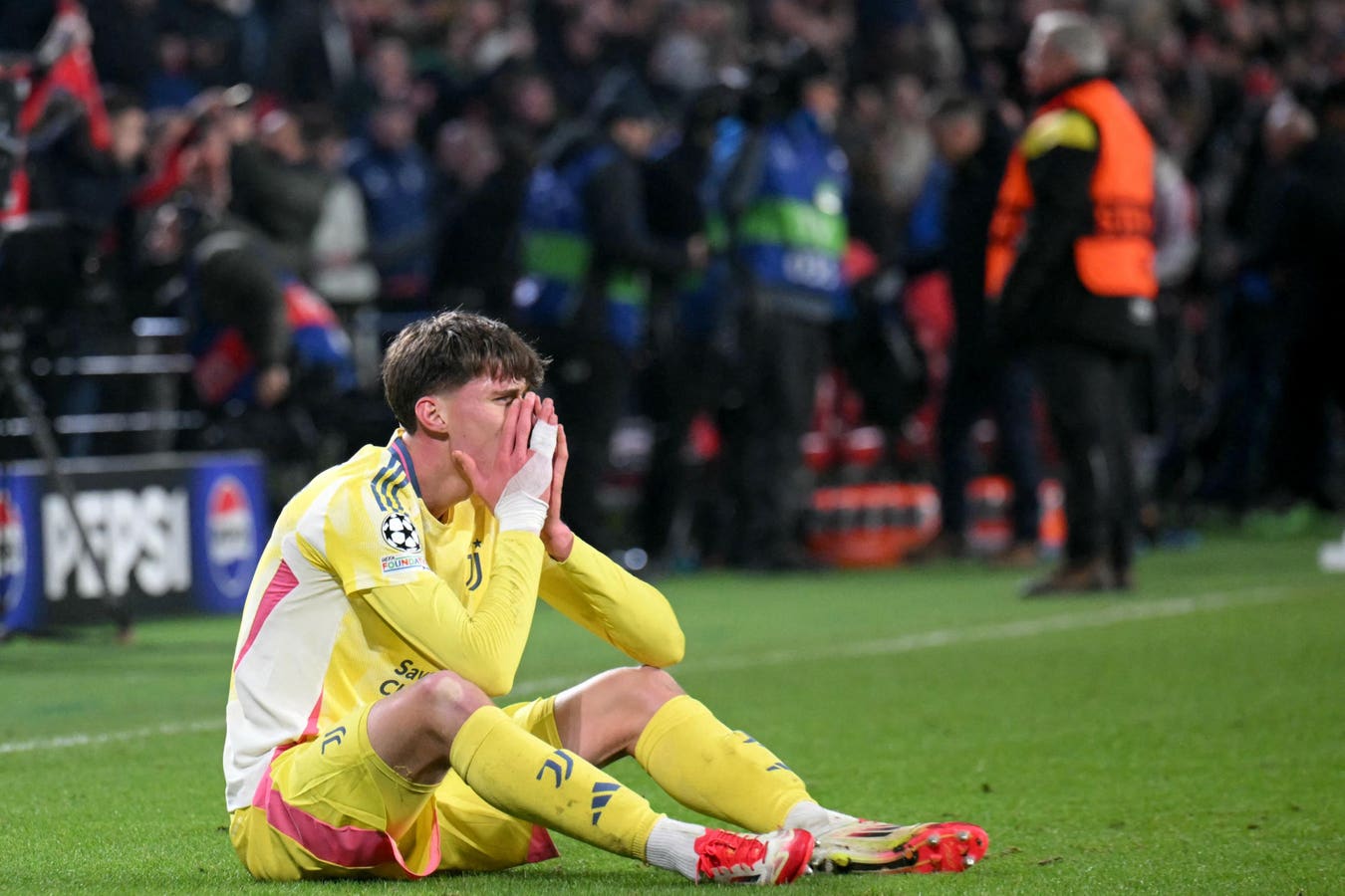 Nicolo Savona reacts to the end of Juventus’ Champions League campaign (Photo by NICOLAS TUCAT / … [+] AFP) (Photo by NICOLAS TUCAT/AFP via Getty Images)