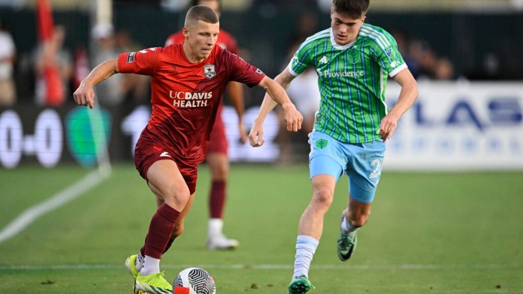 Jack Gurr, left, of the USL Championship’s Sacramento Republic FC dribbles against Reed … [+] Baker-Whiting of Seattle Sounders FC in the first half of their U.S. Open Cup meeting last July.