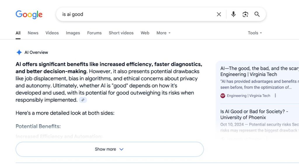 Google’s AI Overviews do not save me time. For one, I work for a tech blog and am therefore professionally curious as to whether or not the generated answers are correct, so I spend a few ticks figuring that out. (Answer: Sometimes, but not always!)