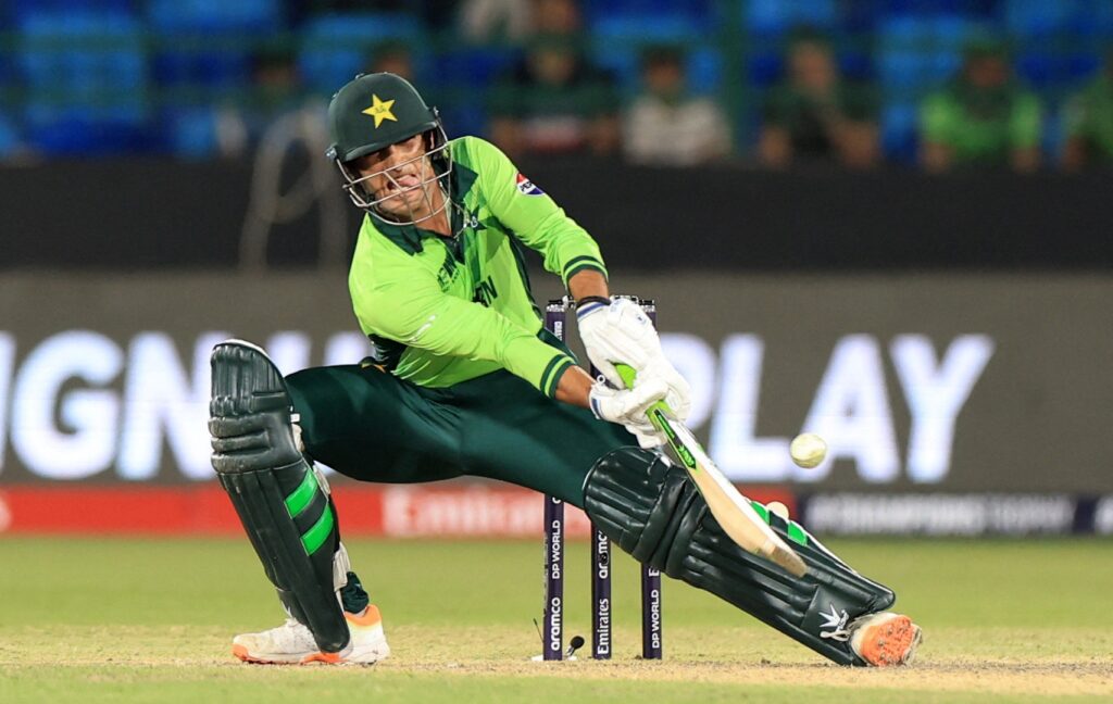 Pakistan’s Khushdil Shah almost single-handedly kept the chase alive [Akhtar Soomro/Reuters]