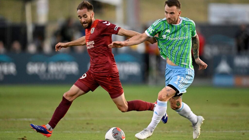 Albert Rusnák, right, of the MLS’ Seattle Sounders FC and Nick Ross of the USL Championship’s … [+]