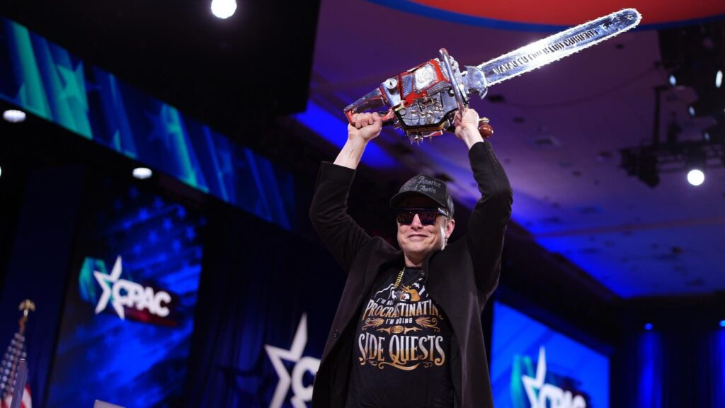 OXON HILL, MARYLAND – FEBRUARY 20: CEO of Tesla and SpaceX Elon Musk leaves the stage holding a … [+] chainsaw after speaking at the Conservative Political Action Conference (CPAC) at the Gaylord National Resort Hotel And Convention Center on February 20, 2025 in Oxon Hill, Maryland. (Photo by Andrew Harnik/Getty Images)