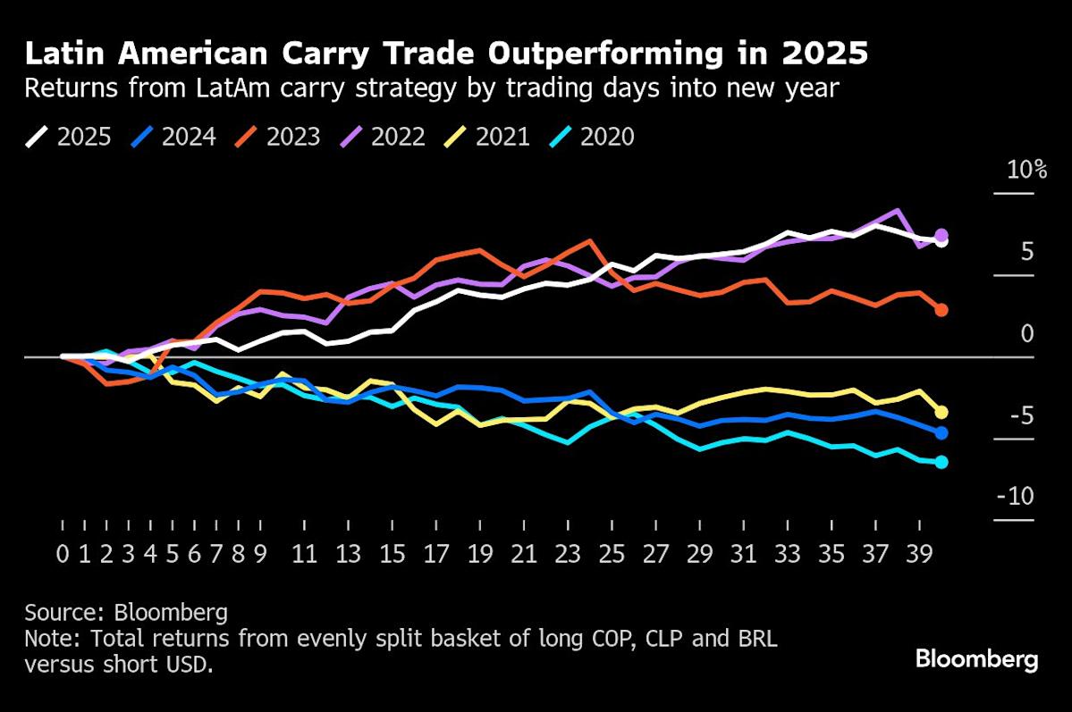 Currencies of countries with high interest rates, particularly in Latin America, have led the charge as carry traders seek to take advantage of the higher yields. Investors buying an evenly-split basket of the Colombian and Chilean pesos and the Brazilian real versus the US dollar have nabbed a roughly 7.3% total return in the first 40 sessions of the year. That’s the highest since 2022 and the second-most in more than a decade.