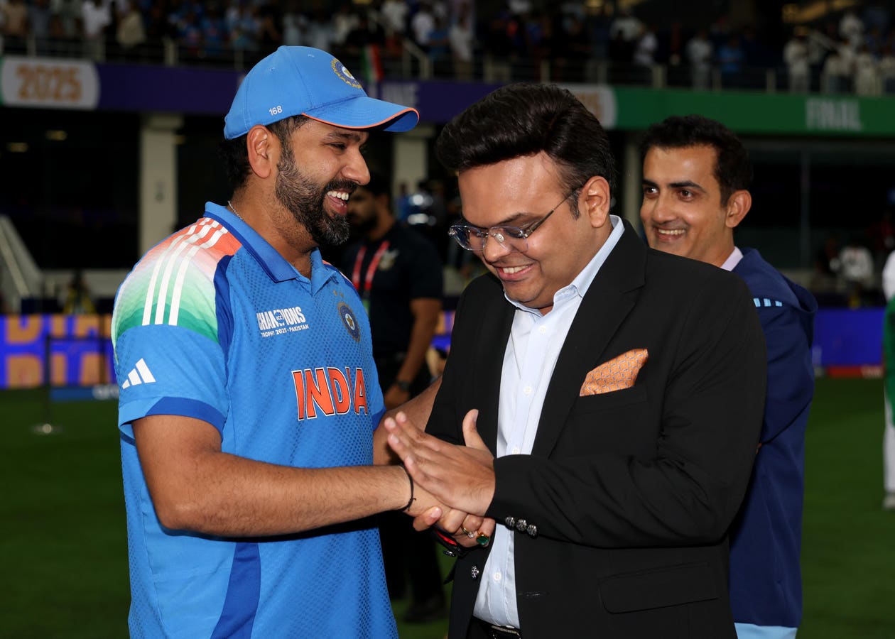 Jay Shah (L) presents the winning trophy to India’s captain Rohit Sharma (Photo by FADEL SENNA/AFP … [+] via Getty Images)