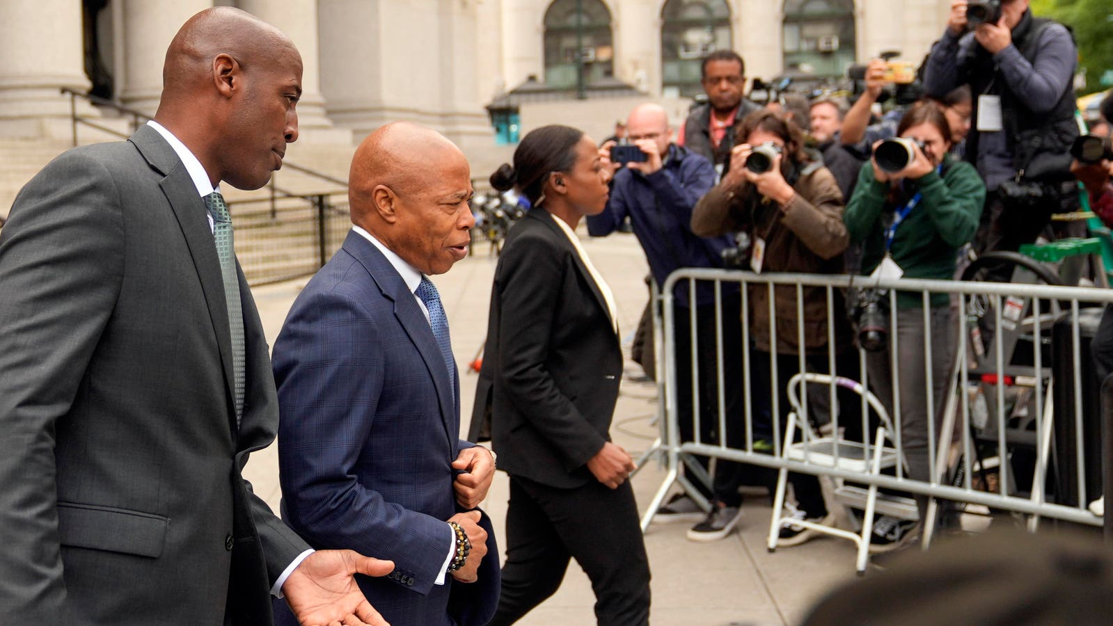 New York City Mayor Eric Adams, second from left, leaves the courthouse in New York, Oct. 2, 2024.