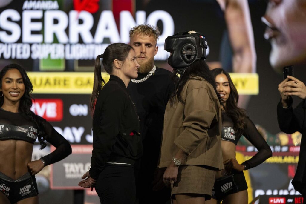 NEW YORK, USA – APRIL 09: Katie Taylor (L), Amanda Serrano (R), and Jake Paul (M) during the … More