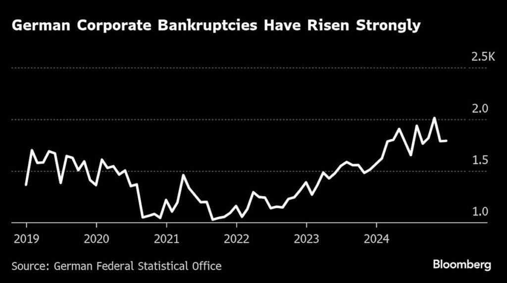 About $6.3 billion of German corporate debt was distressed on March 21, an increase of $543 million from the previous week, according to data compiled by Bloomberg News. While optimism about the country’s economic outlook is improving amid a plan to spend more on defense, bankruptcies have been on the rise as higher borrowing and energy costs weigh on companies.