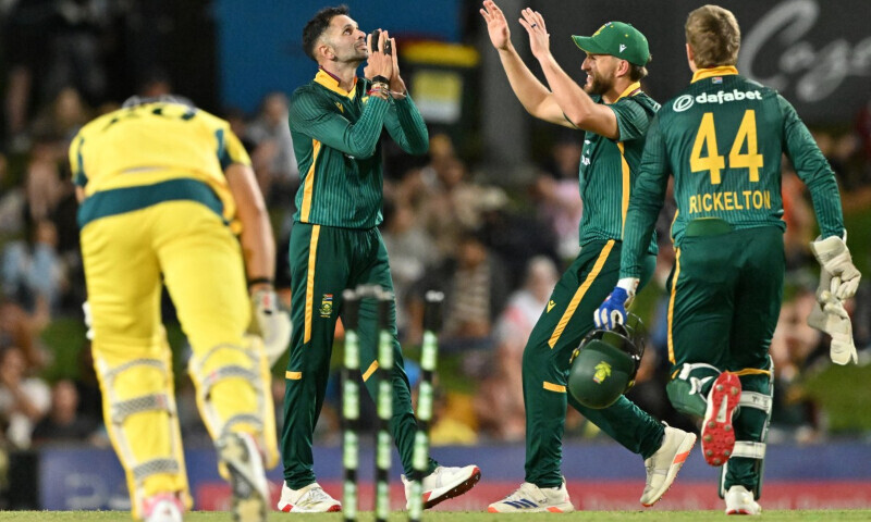 Making his return since being axed from Australia’s Test team, Marnus Labuschagne (one) fell on his sixth delivery after unsuccessfully reviewing an lbw decision off Maharaj.
